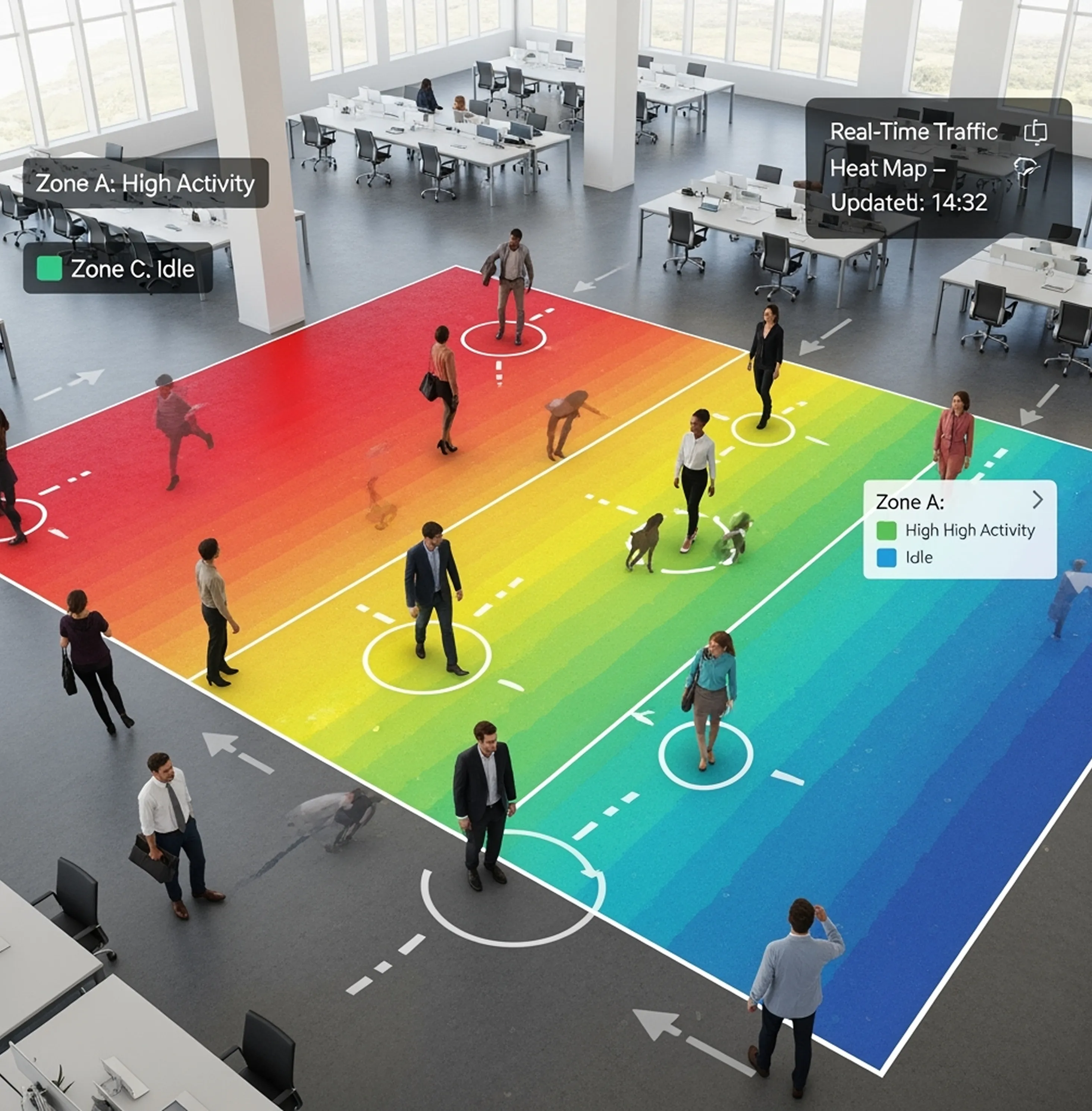 Displays dense activity zones to support strategic space utilization and improve operations.